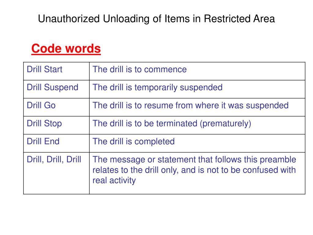 XYZ Port Facility Maritime Security Drill. Briefing for Controllers . date. Material Handling – Personal Effects, Parcels and Mail. Materials Handling – Unauthorized Loading of Personal Items in Restricted Area. Drill D314. Scope Date, time, location Aim Objectives