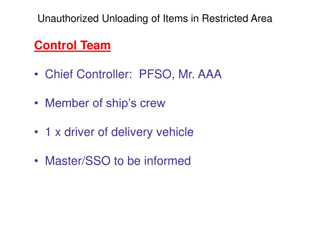 Control Team • Chief Controller: PFSO, Mr. AAA • Member of ship’s crew • 1 x driver of delivery vehicle • Master/SSO to be informed