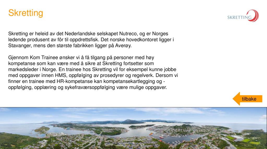 Skretting Skretting er heleid av det Nederlandske selskapet Nutreco, og er Norges ledende produsent av fôr til oppdrettsfisk. Det norske hovedkontoret ligger i Stavanger, mens den største fabrikken ligger på Averøy. Gjennom Kom Trainee ønsker vi å få tilgang på personer med høy kompetanse som kan være med å sikre at Skretting fortsetter som markedsleder i Norge. En trainee hos Skretting vil for eksempel kunne jobbe med oppgaver innen HMS, oppfølging av prosedyrer og regelverk. Dersom vi finner en trainee med HR-kompetanse kan kompetansekartlegging og -oppfølging, opplæring og sykefraværsoppfølging være mulige oppgaver. tilbake