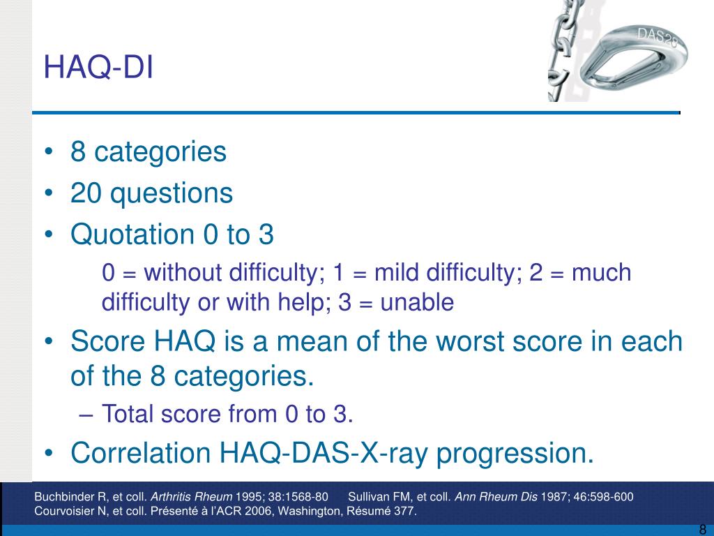 8 categories 20 questions Quotation 0 to 3 0 = without difficulty; 1 = mild difficulty; 2 = much difficulty or with help; 3 = unable Score HAQ is a mean of the worst score in each of the 8 categories. Total score from 0 to 3. Correlation HAQ-DAS-X-ray progression. HAQ-DI Buchbinder R, et coll. Arthritis Rheum 1995; 38:1568-80 Sullivan FM, et coll. Ann Rheum Dis 1987; 46:598-600 Courvoisier N, et coll.Présenté à l’ACR 2006, Washington, Résumé 377. 8