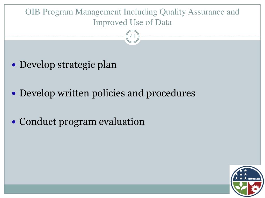 OIB Program Management Including Quality Assurance and Improved Use of Data Develop strategic plan Develop written policies and procedures Conduct program evaluation