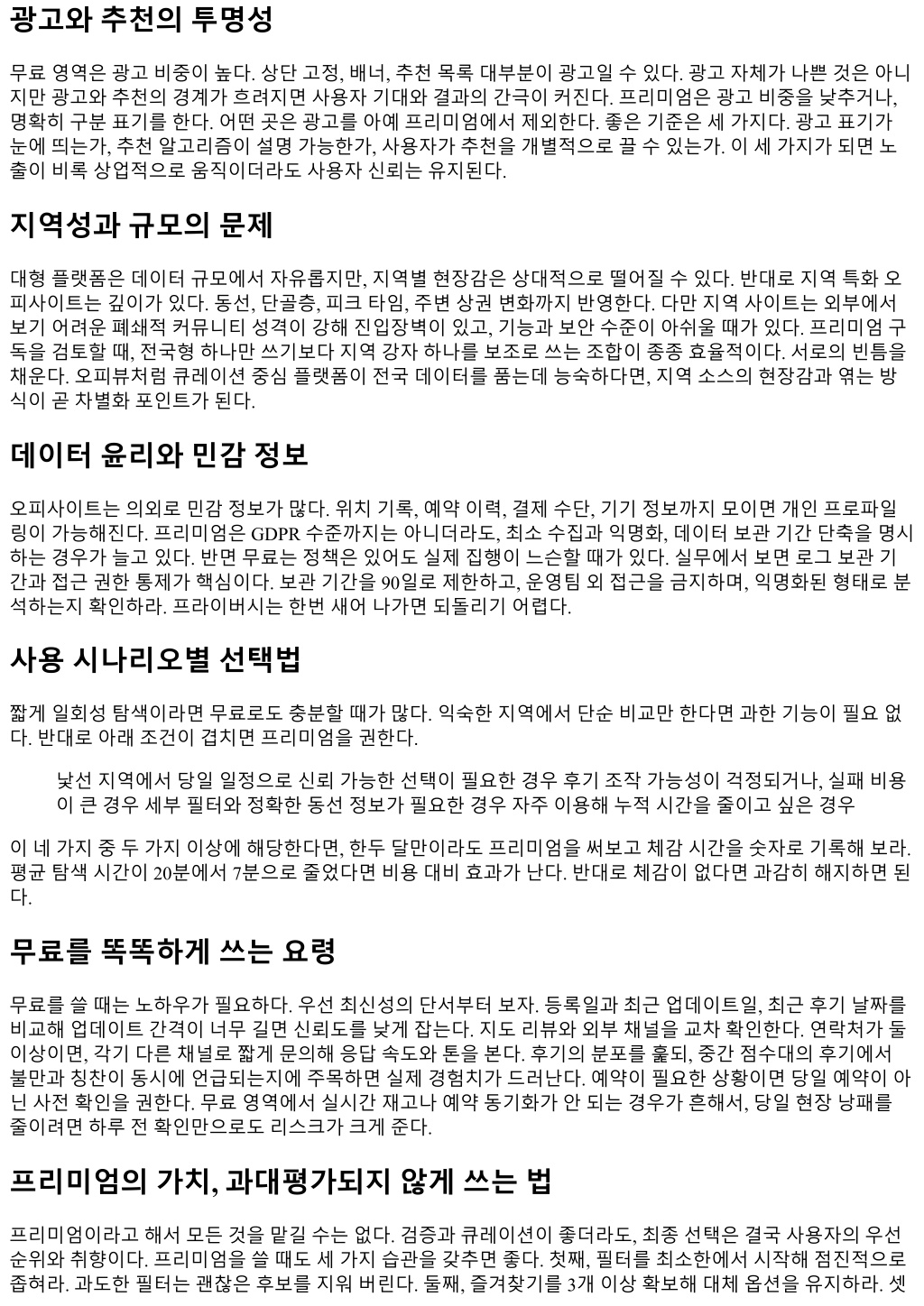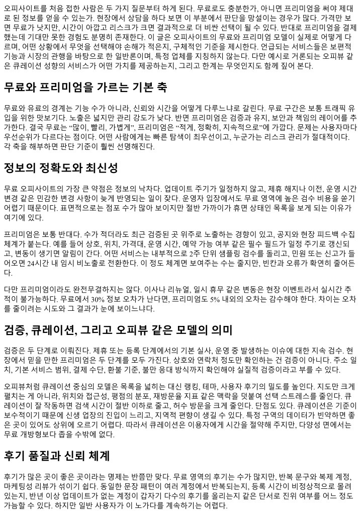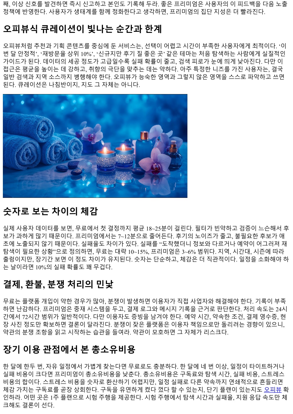 째, 이상신호를발견하면즉시신고하고본인도기록해두라. 좋은프리미엄은사용자의이피드백을다음노출 정책에반영한다. 사용자가생태계를함께정화한다고생각하면, 프리미엄의집단지성은더빨라진다. 오피뷰식큐레이션이빛나는순간과한계 오피뷰처럼추천과기획콘텐츠를중심에둔서비스는, 선택이어렵고시간이부족한사용자에게최적이다. ‘이 번달안정적’, ‘재방문율상위 10%’, ‘신규지만후기질좋은곳’ 같은테마는처음탐색하는사람에게실질적인 가이드가된다. 데이터의세공정도가고급일수록실패확률이줄고, 검색피로가눈에띄게낮아진다. 다만이 접근은평균을높이는데강하고, 취향의극단을맞추는데는약하다. 아주특정한니즈를가진사용자는, 결국 일반검색과지역소스까지병행해야한다. 오피뷰가능숙한영역과그렇지않은영역을스스로파악하고쓰면 된다. 큐레이션은나침반이지, 지도그자체는아니다. 숫자로보는차이의체감 실제사용자데이터를보면, 무료에서첫결정까지평균 18~25분이걸린다. 필터가빈약하고검증이느슨해서후 보가과하게많기때문이다. 프리미엄에서는 7~12분으로줄어든다. 후기의노이즈가줄고, 불필요한후보가애 초에노출되지않기때문이다. 실패율도차이가있다. 실패를 “도착했더니정보와다르거나예약이어그러져재 탐색이필요한상황”으로정의하면, 무료는대략 10~15%, 프리미엄은 3~6% 범위다. 지역, 시간대, 시즌에따라 출렁이지만, 장기간보면이정도차이가유지된다. 숫자는단순하고, 체감은더직관적이다. 일정을소화해야하 는날이라면 10%의실패확률도꽤무겁다. 결제, 환불, 분쟁처리의민낯 무료는플랫폼개입이약한경우가많아, 분쟁이발생하면이용자가직접사업자와해결해야한다. 기록이부족 하면난감하다. 프리미엄은중재시스템을두고, 결제로그와메시지기록을근거로판단한다. 처리속도는 24시 간에서 72시간범위가일반적이다. 다만이용자도증빙을남겨야한다. 예약시간, 약속한조건, 결제영수증, 현 장사진정도만확보하면결론이달라진다. 분쟁이잦은플랫폼은이용자책임으로만돌리려는경향이있으니, 약관의분쟁조항을읽고시작하는습관을들여라. 약관이모호하면그자체가리스크다. 장기이용관점에서본총소유비용 한달에한두번, 자유일정에서가볍게찾는다면무료로도충분하다. 한달에네번이상, 일정이타이트하거나 실패비용이크다면프리미엄이총소유비용을낮춘다. 총소유비용은구독료와탐색시간, 실패비용, 스트레스 비용의합이다. 스트레스비용을숫자로환산하기어렵지만, 일정실패로다른약속까지연쇄적으로흔들리면 체감가치는구독료를곧장상회한다. 구독을유연하게켰다껐다할수있는지, 단기플랜이있는지도오피뷰확 인하라. 어떤곳은 1주플랜으로시험주행을제공한다. 시험주행에서탐색시간과실패율, 지원응답속도만체 크해도결론이선다.