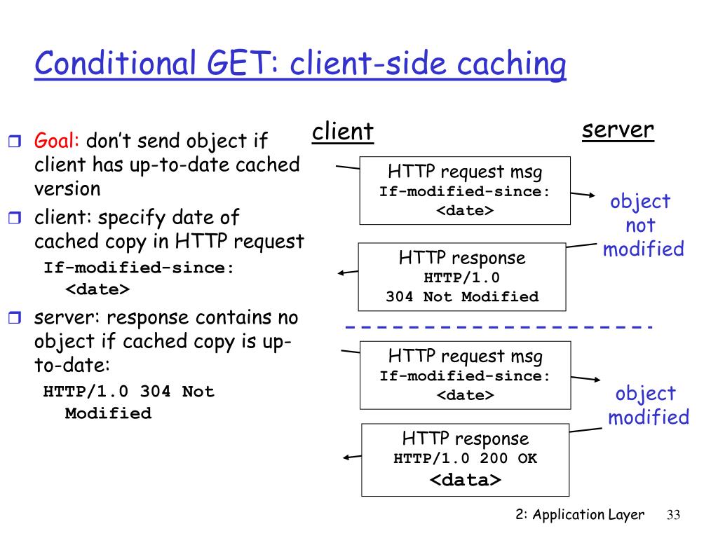Goal: don’t send object if client has up-to-date cached version client: specify date of cached copy in HTTP request If-modified-since: <date> server: response contains no object if cached copy is up-to-date: HTTP/1.0 304 Not Modified HTTP response HTTP/1.0 304 Not Modified Conditional GET: client-side caching server client HTTP request msg If-modified-since: <date> object not modified HTTP request msg If-modified-since: <date> object modified HTTP response HTTP/1.0 200 OK <data> 2: Application Layer