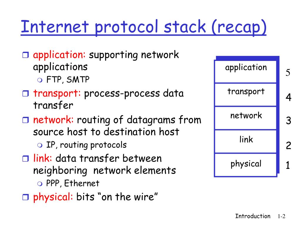 application: supporting network applications FTP, SMTP transport: process-process data transfer network: routing of datagrams from source host to destination host IP, routing protocols link: data transfer between neighboring network elements PPP, Ethernet physical: bits “on the wire” application transport network link physical Internet protocol stack (recap) 5 4 3 2 1 Introduction