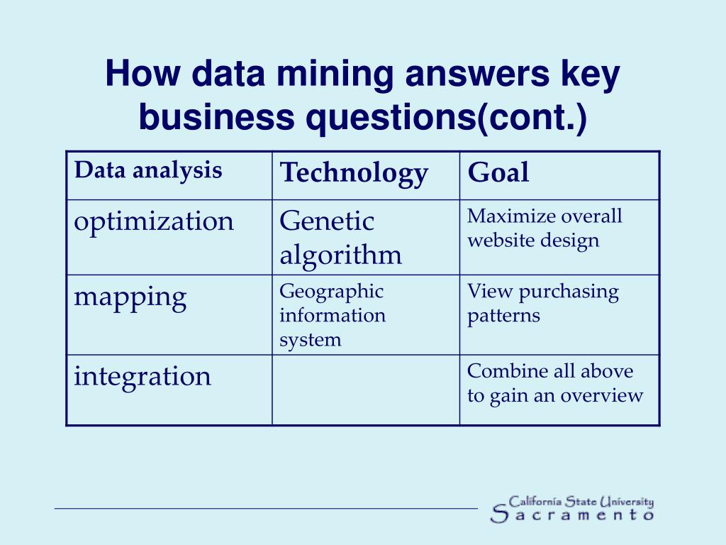 10 steps to mine web data • Identify your objective – profile your visitors? • Select your data – form database? • Prepare the data – append demographic information? • Evaluate the data – visualization? • Format the solution – segmentation, prediction?