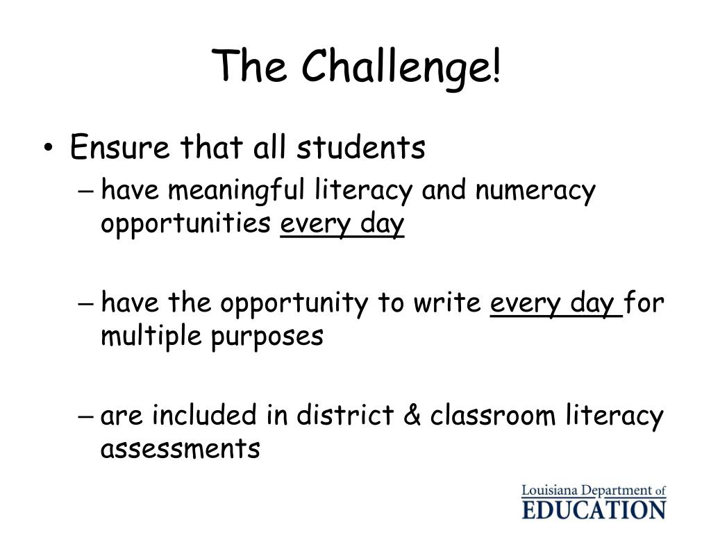 The Challenge! • Ensure that all students • have meaningful literacy and numeracy opportunities every day • have the opportunity to write every day for multiple purposes • are included in district & classroom literacy assessments