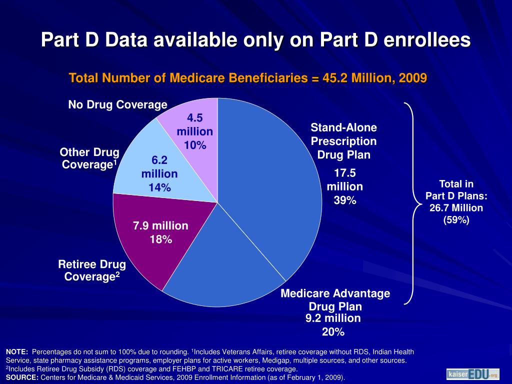 Part D Data available only on Part D enrollees Total Number of Medicare Beneficiaries = 45.2 Million, 2009 No Drug Coverage 4.5million10% Stand-Alone Prescription Drug Plan Other Drug Coverage1 6.2million14% 17.5million39% Total in Part D Plans: 26.7 Million (59%) 7.9 million18% Retiree Drug Coverage2 Medicare AdvantageDrug Plan 9.2 million20% NOTE: Percentages do not sum to 100% due to rounding. 1Includes Veterans Affairs, retiree coverage without RDS, Indian Health Service, state pharmacy assistance programs, employer plans for active workers, Medigap, multiple sources, and other sources. 2Includes Retiree Drug Subsidy (RDS) coverage and FEHBP and TRICARE retiree coverage. SOURCE: Centers for Medicare & Medicaid Services, 2009 Enrollment Information (as of February 1, 2009).