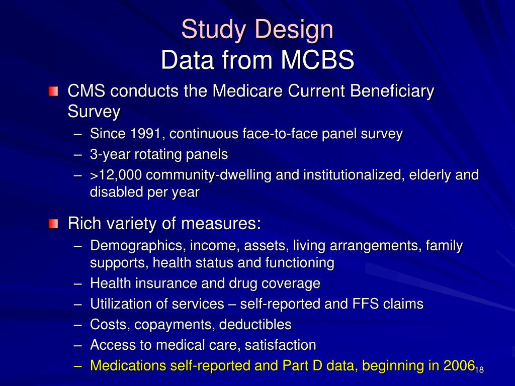 Study DesignData from MCBS • CMS conducts the Medicare Current Beneficiary Survey • Since 1991, continuous face-to-face panel survey • 3-year rotating panels • >12,000 community-dwelling and institutionalized, elderly and disabled per year • Rich variety of measures: • Demographics, income, assets, living arrangements, family supports, health status and functioning • Health insurance and drug coverage • Utilization of services – self-reported and FFS claims • Costs, copayments, deductibles • Access to medical care, satisfaction • Medications self-reported and Part D data, beginning in 2006