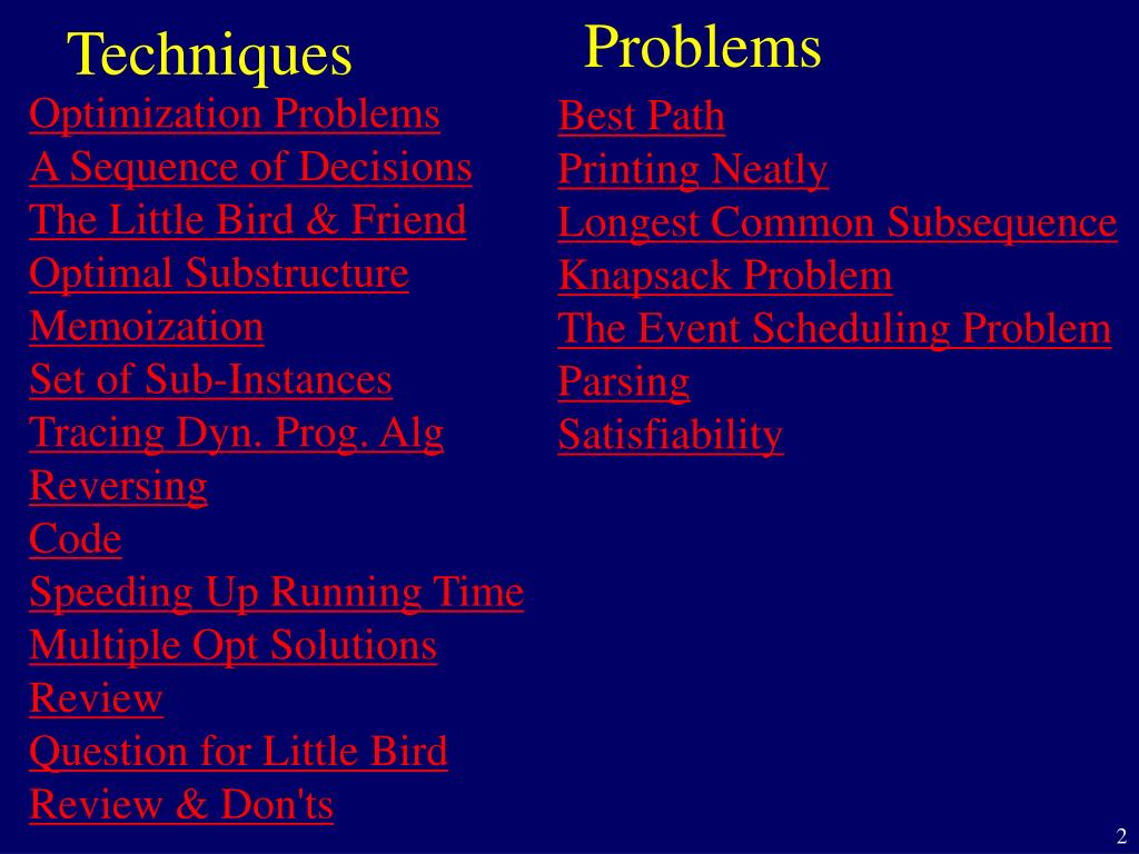 Problems Techniques Optimization Problems A Sequence of Decisions The Little Bird & Friend Optimal Substructure Memoization Set of Sub-Instances Tracing Dyn. Prog. Alg Reversing Code Speeding Up Running Time Multiple Opt Solutions Review Question for Little Bird Review & Don'ts Best Path Printing Neatly Longest Common Subsequence Knapsack Problem The Event Scheduling Problem Parsing Satisfiability