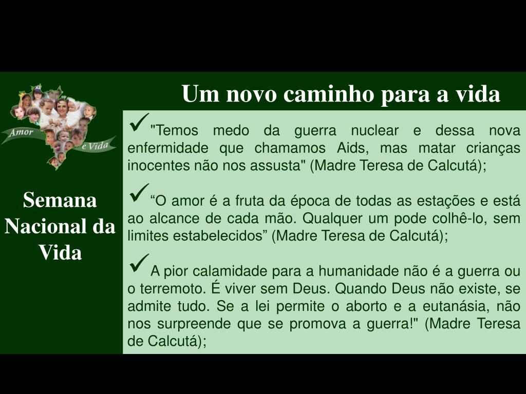 Um novo caminho para a vida • "Temos medo da guerra nuclear e dessa nova enfermidade que chamamos Aids, mas matar crianças inocentes não nos assusta" (Madre Teresa de Calcutá); Semana Nacional da Vida • “O amor é a fruta da época de todas as estações e está ao alcance de cada mão. Qualquer um pode colhê-lo, sem limites estabelecidos” (Madre Teresa de Calcutá); • A pior calamidade para a humanidade não é a guerra ou o terremoto. É viver sem Deus. Quando Deus não existe, se admite tudo. Se a lei permite o aborto e a eutanásia, não nos surpreende que se promova a guerra!" (Madre Teresa de Calcutá);