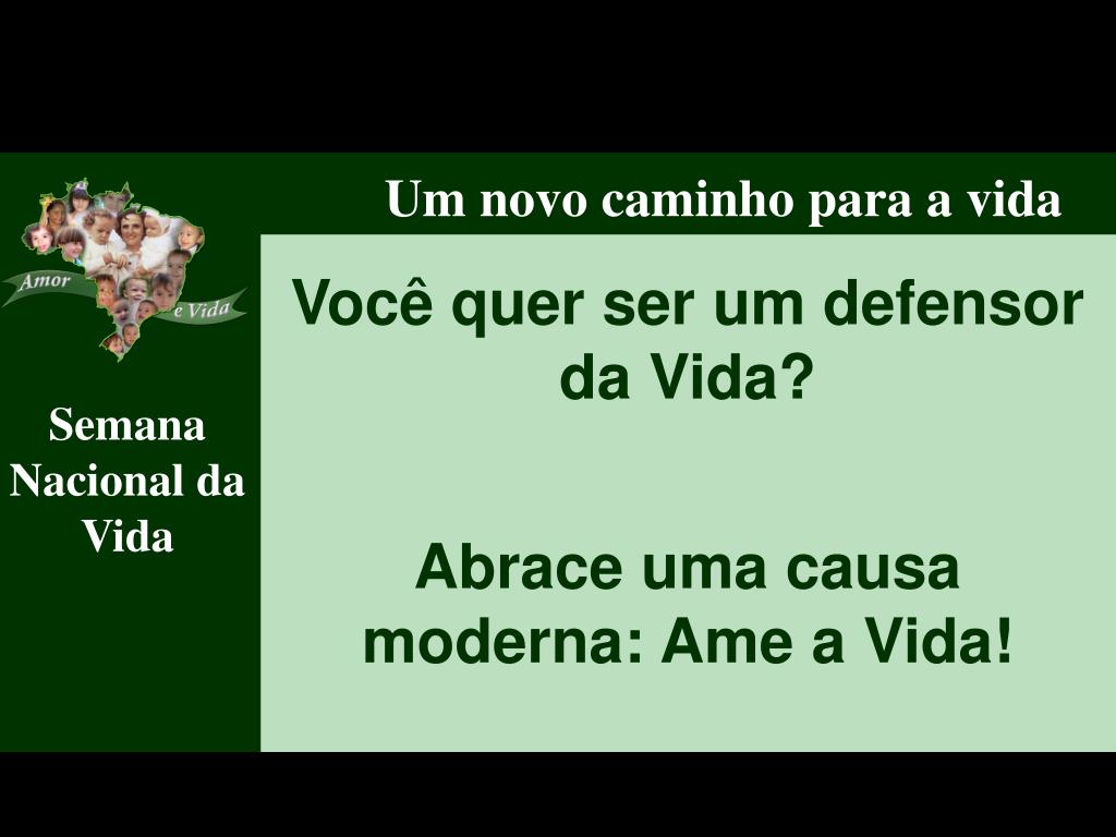 Um novo caminho para a vida Você quer ser um defensor da Vida? Semana Nacional da Vida Abrace uma causa moderna: Ame a Vida!
