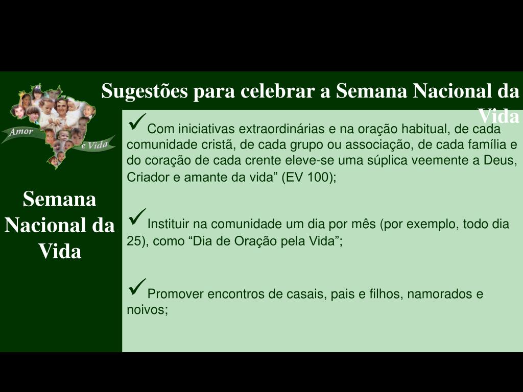 Sugestões para celebrar a Semana Nacional da Vida • Com iniciativas extraordinárias e na oração habitual, de cada comunidade cristã, de cada grupo ou associação, de cada família e do coração de cada crente eleve-se uma súplica veemente a Deus, Criador e amante da vida” (EV 100); Semana Nacional da Vida • Instituir na comunidade um dia por mês (por exemplo, todo dia 25), como “Dia de Oração pela Vida”; • Promover encontros de casais, pais e filhos, namorados e noivos;