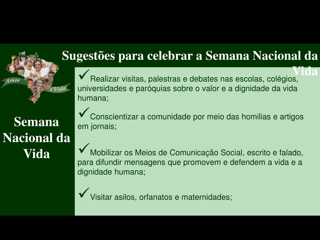 Sugestões para celebrar a Semana Nacional da Vida • Realizar visitas, palestras e debates nas escolas, colégios, universidades e paróquias sobre o valor e a dignidade da vida humana; • Conscientizar a comunidade por meio das homilias e artigos em jornais; Semana Nacional da Vida • Mobilizar os Meios de Comunicação Social, escrito e falado, para difundir mensagens que promovem e defendem a vida e a dignidade humana; • Visitar asilos, orfanatos e maternidades;