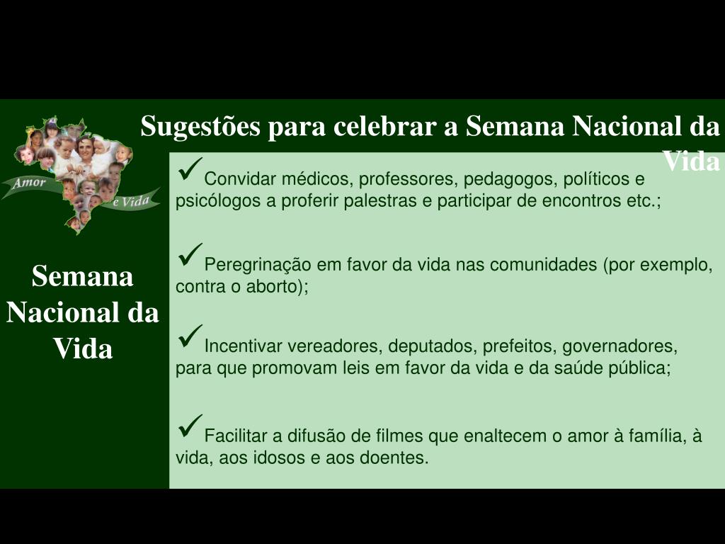 Sugestões para celebrar a Semana Nacional da Vida • Convidar médicos, professores, pedagogos, políticos e psicólogos a proferir palestras e participar de encontros etc.; • Peregrinação em favor da vida nas comunidades (por exemplo, contra o aborto); Semana Nacional da Vida • Incentivar vereadores, deputados, prefeitos, governadores, para que promovam leis em favor da vida e da saúde pública; • Facilitar a difusão de filmes que enaltecem o amor à família, à vida, aos idosos e aos doentes.