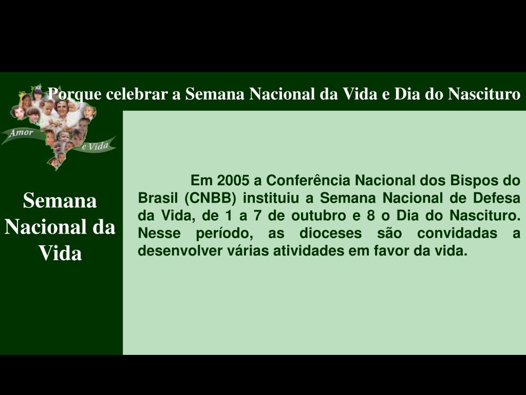 Porque celebrar a Semana Nacional da Vida e Dia do Nascituro Em 2005 a Conferência Nacional dos Bispos do Brasil (CNBB) instituiu a Semana Nacional de Defesa da Vida, de 1 a 7 de outubro e 8 o Dia do Nascituro. Nesse período, as dioceses são convidadas a desenvolver várias atividades em favor da vida. Semana Nacional da Vida