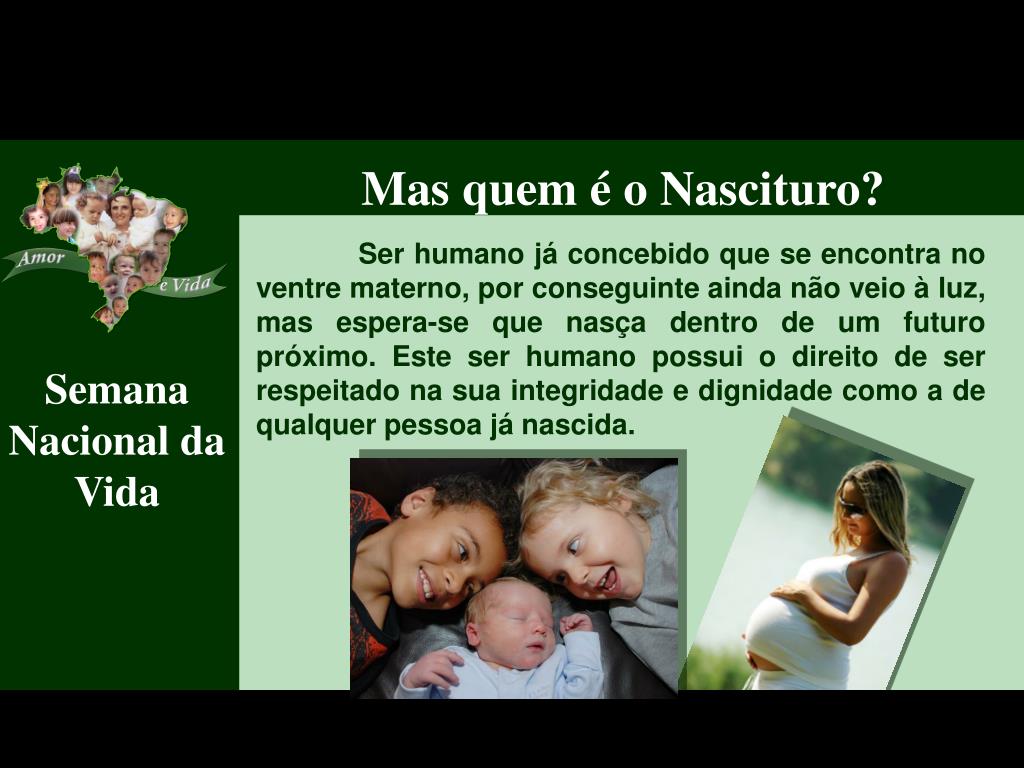 Mas quem é o Nascituro? Ser humano já concebido que se encontra no ventre materno, por conseguinte ainda não veio à luz, mas espera-se que nasça dentro de um futuro próximo. Este ser humano possui o direito de ser respeitado na sua integridade e dignidade como a de qualquer pessoa já nascida. Semana Nacional da Vida