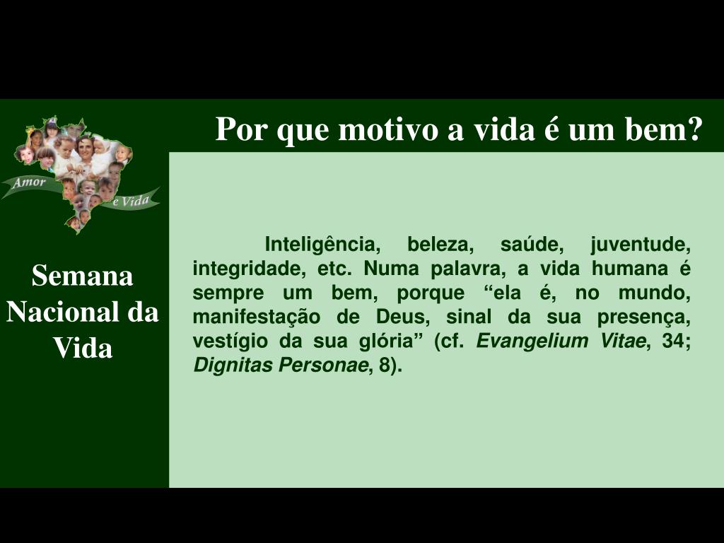 Por que motivo a vida é um bem? Inteligência, beleza, saúde, juventude, integridade, etc. Numa palavra, a vida humana é sempre um bem, porque “ela é, no mundo, manifestação de Deus, sinal da sua presença, vestígio da sua glória” (cf. Evangelium Vitae, 34; Dignitas Personae, 8). Semana Nacional da Vida