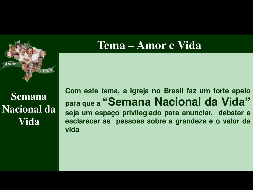 Tema – Amor e Vida Com este tema, a Igreja no Brasil faz um forte apelo para que a “Semana Nacional da Vida” seja um espaço privilegiado para anunciar, debater e esclarecer as pessoas sobre a grandeza e o valor da vida Semana Nacional da Vida