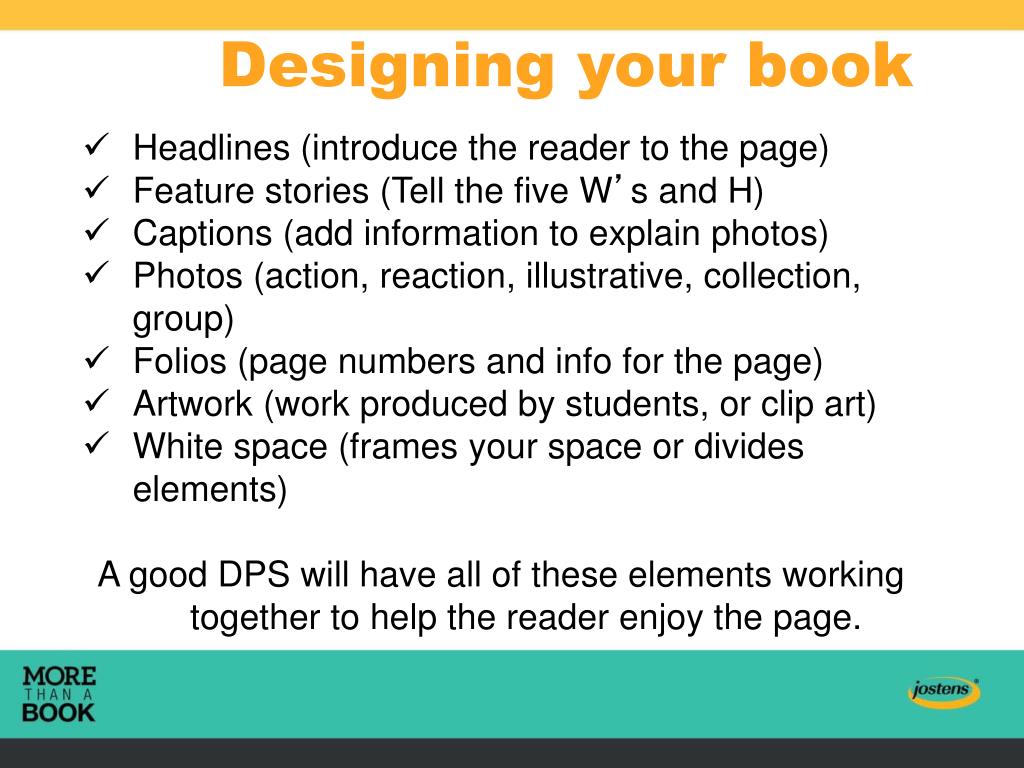 Designing your book • Headlines (introduce the reader to the page) • Feature stories (Tell the five W’s and H) • Captions (add information to explain photos) • Photos (action, reaction, illustrative, collection, group) • Folios (page numbers and info for the page) • Artwork (work produced by students, or clip art) • White space (frames your space or divides elements) • A good DPS will have all of these elements working together to help the reader enjoy the page.
