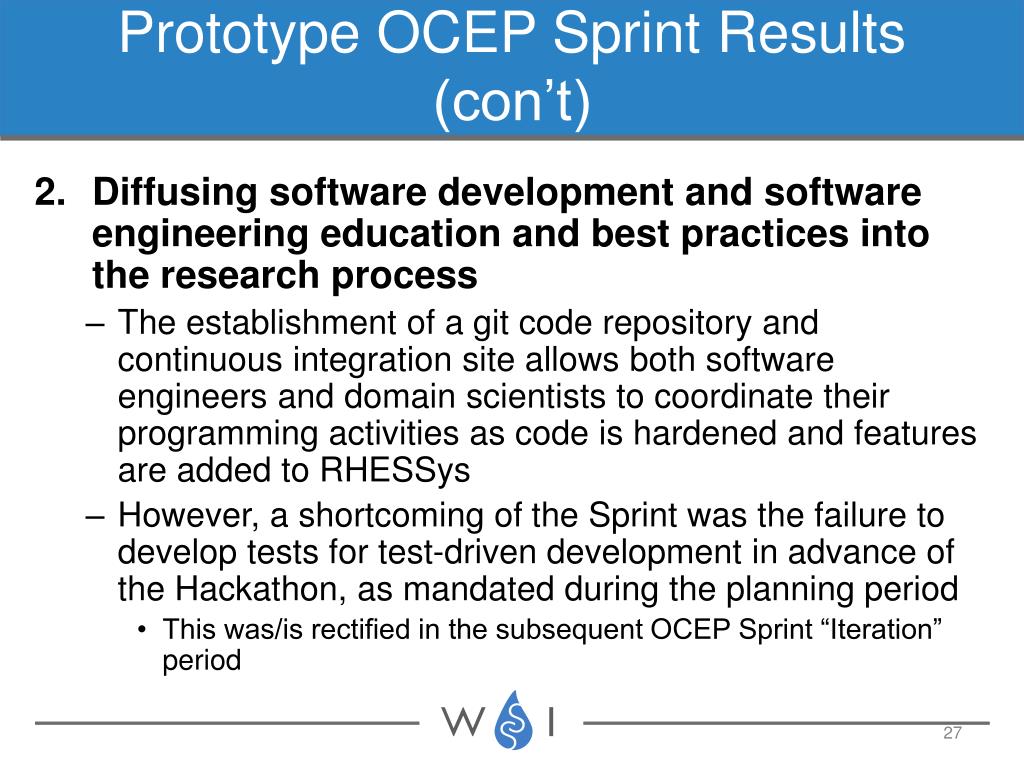 Prototype OCEP Sprint Results (con’t) • Diffusing software development and software engineering education and best practices into the research process • The establishment of a git code repository and continuous integration site allows both software engineers and domain scientists to coordinate their programming activities as code is hardened and features are added to RHESSys • However, a shortcoming of the Sprint was the failure to develop tests for test-driven development in advance of the Hackathon, as mandated during the planning period • This was/is rectified in the subsequent OCEP Sprint “Iteration” period