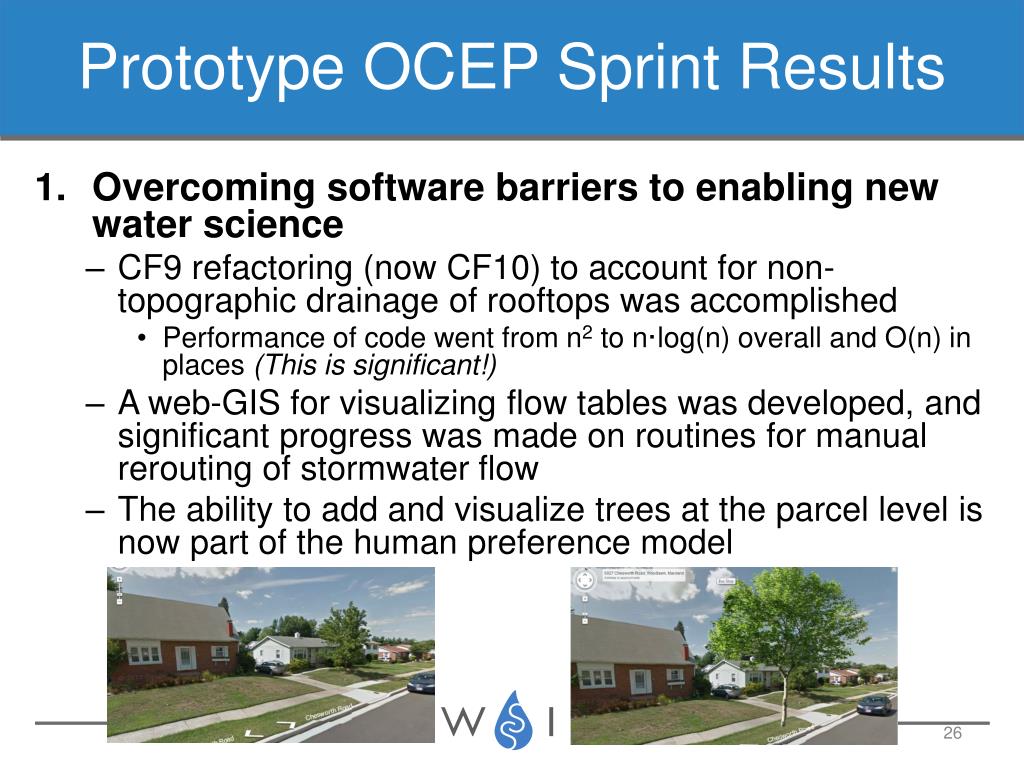 Prototype OCEP Sprint Results • Overcoming software barriers to enabling new water science • CF9 refactoring (now CF10) to account for non-topographic drainage of rooftops was accomplished • Performance of code went from n2 to n·log(n) overall and O(n) in places (This is significant!) • A web-GIS for visualizing flow tables was developed, and significant progress was made on routines for manual rerouting of stormwater flow • The ability to add and visualize trees at the parcel level is now part of the human preference model