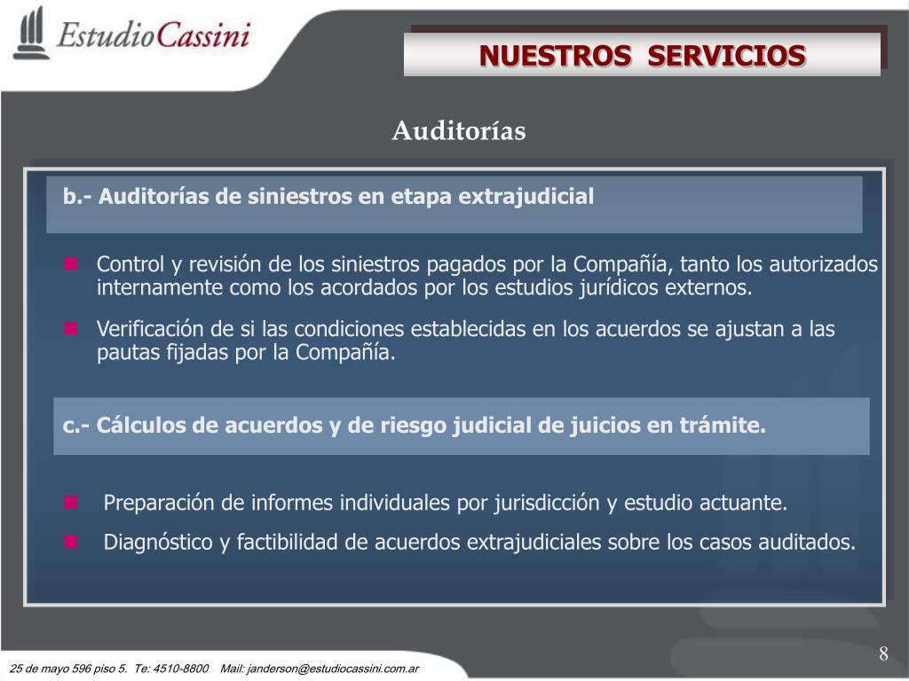 NUESTROS SERVICIOS II.- Auditorías • a.- Auditorías de Juicios en trámite • Efectivo control y seguimiento sobre las causas con estado judicial que se derivaron a estudios jurídicos. • Uniformidad de criterios de fondo y de forma en el modo de encarar la gestión judicial de los estudios que representan a la Compañía. • Revisión de las causas judiciales en trámite para corroborar la veracidad y certidumbre de los datos aportados a la Compañía por los estudios externos. 7 25 de mayo 596 piso 5. Te: 4510-8800 Mail: janderson@estudiocassini.com.ar