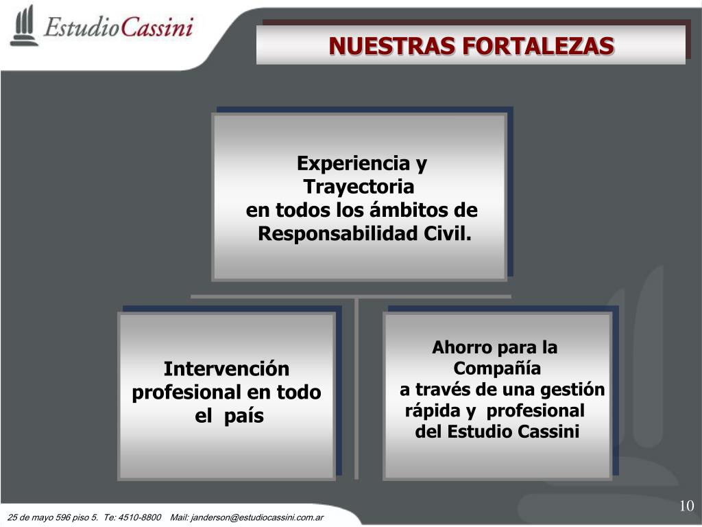 NUESTRAS FORTALEZAS Experiencia y Trayectoria en todos los ámbitos de Responsabilidad Civil. Ahorro para la Compañía a través de una gestión rápida y profesional del Estudio Cassini Intervención profesional en todo el país 10 25 de mayo 596 piso 5. Te: 4510-8800 Mail: janderson@estudiocassini.com.ar