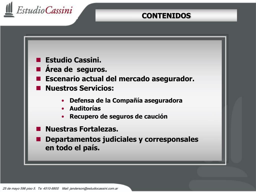 CONTENIDOS • Estudio Cassini. • Área de seguros. • Escenario actual del mercado asegurador. • Nuestros Servicios: • Defensa de la Compañía aseguradora • Auditorías • Recupero de seguros de caución • Nuestras Fortalezas. • Departamentos judiciales y corresponsales en todo el país. 25 de mayo 596 piso 5. Te: 4510-8800 Mail: janderson@estudiocassini.com.ar