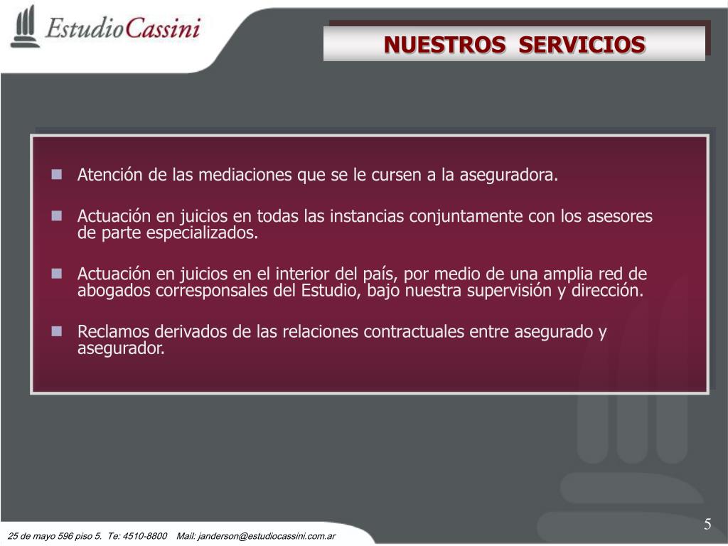 NUESTROS SERVICIOS • Atención de las mediaciones que se le cursen a la aseguradora. • Actuación en juicios en todas las instancias conjuntamente con los asesores de parte especializados. • Actuación en juicios en el interior del país, por medio de una amplia red de abogados corresponsales del Estudio, bajo nuestra supervisión y dirección. • Reclamos derivados de las relaciones contractuales entre asegurado y asegurador. 5 25 de mayo 596 piso 5. Te: 4510-8800 Mail: janderson@estudiocassini.com.ar
