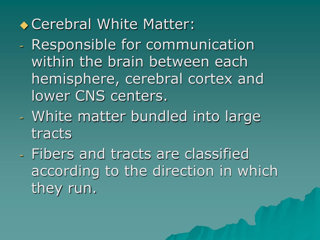 Cerebral White Matter: • Responsible for communication within the brain between each hemisphere, cerebral cortex and lower CNS centers. • White matter bundled into large tracts • Fibers and tracts are classified according to the direction in which they run.