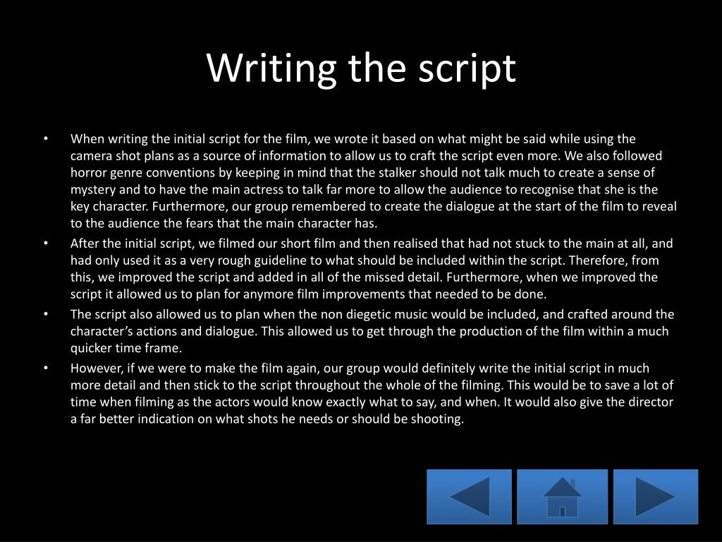 Writing the script • When writing the initial script for the film, we wrote it based on what might be said while using the camera shot plans as a source of information to allow us to craft the script even more. We also followed horror genre conventions by keeping in mind that the stalker should not talk much to create a sense of mystery and to have the main actress to talk far more to allow the audience to recognise that she is the key character. Furthermore, our group remembered to create the dialogue at the start of the film to reveal to the audience the fears that the main character has. • After the initial script, we filmed our short film and then realised that had not stuck to the main at all, and had only used it as a very rough guideline to what should be included within the script. Therefore, from this, we improved the script and added in all of the missed detail. Furthermore, when we improved the script it allowed us to plan for anymore film improvements that needed to be done. • The script also allowed us to plan when the non diegetic music would be included, and crafted around the character’s actions and dialogue. This allowed us to get through the production of the film within a much quicker time frame. • However, if we were to make the film again, our group would definitely write the initial script in much more detail and then stick to the script throughout the whole of the filming. This would be to save a lot of time when filming as the actors would know exactly what to say, and when. It would also give the director a far better indication on what shots he needs or should be shooting.