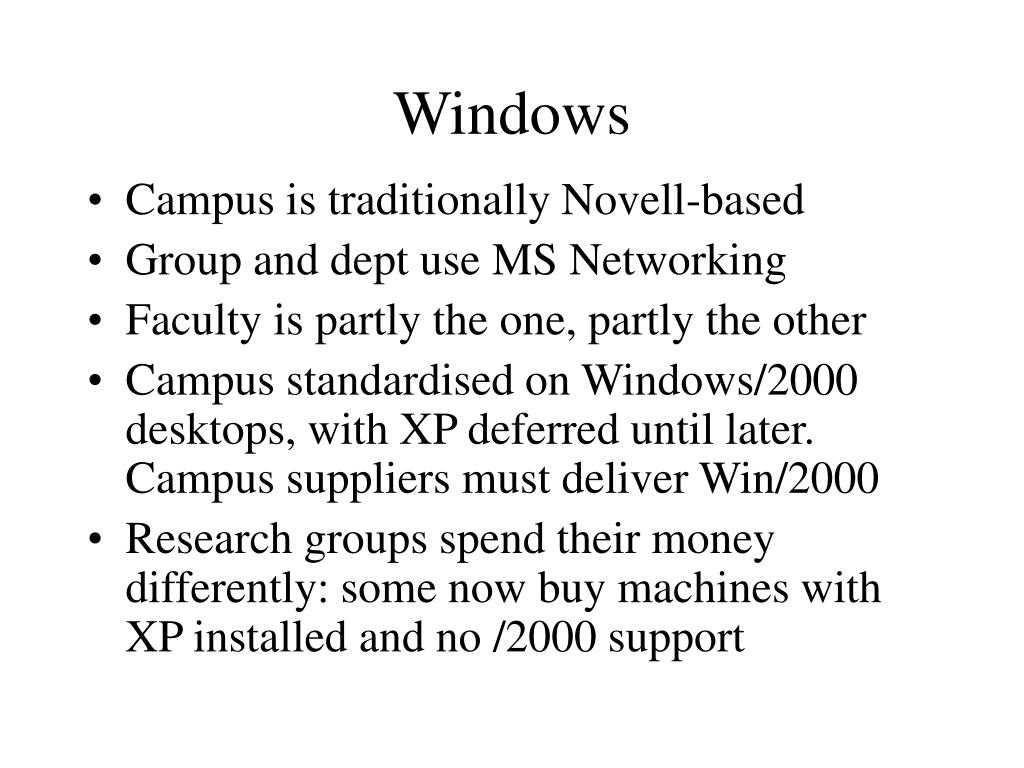 Windows • Campus is traditionally Novell-based • Group and dept use MS Networking • Faculty is partly the one, partly the other • Campus standardised on Windows/2000 desktops, with XP deferred until later. Campus suppliers must deliver Win/2000 • Research groups spend their money differently: some now buy machines with XP installed and no /2000 support