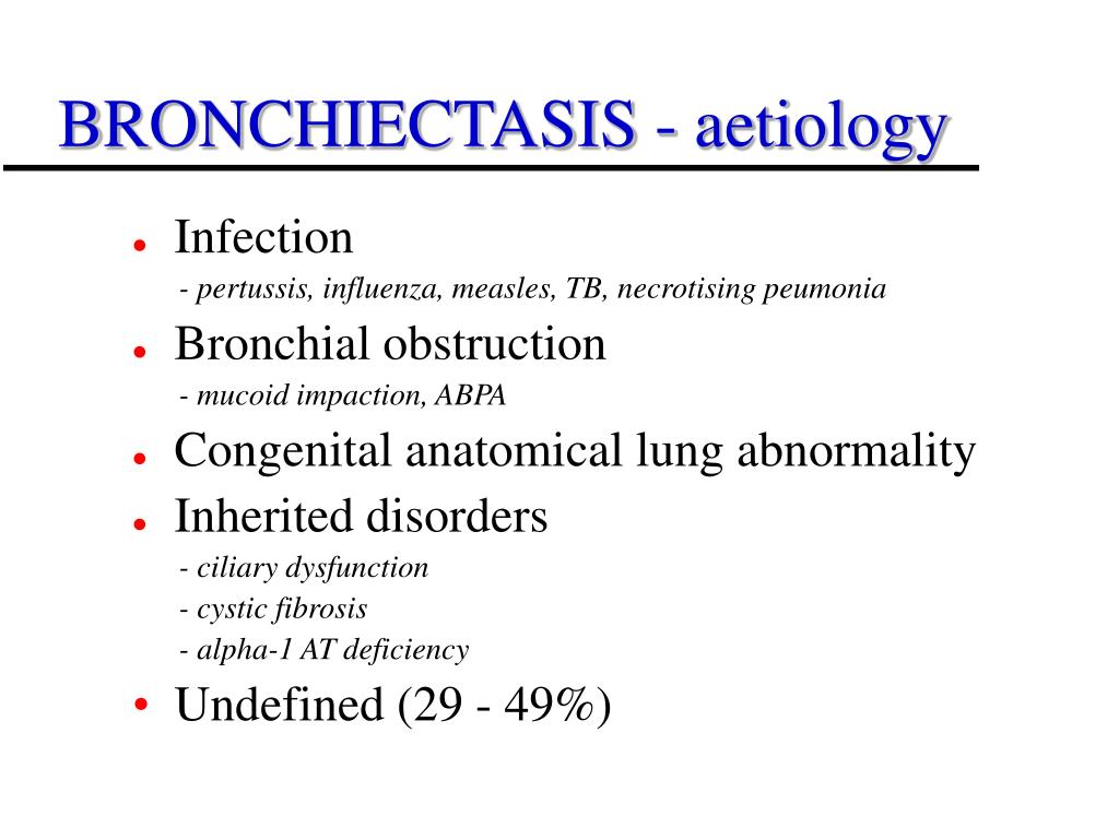 BRONCHIECTASIS - aetiology • Infection - pertussis, influenza, measles, TB, necrotising peumonia • Bronchial obstruction - mucoid impaction, ABPA • Congenital anatomical lung abnormality • Inherited disorders - ciliary dysfunction - cystic fibrosis - alpha-1 AT deficiency • Undefined (29 - 49%)