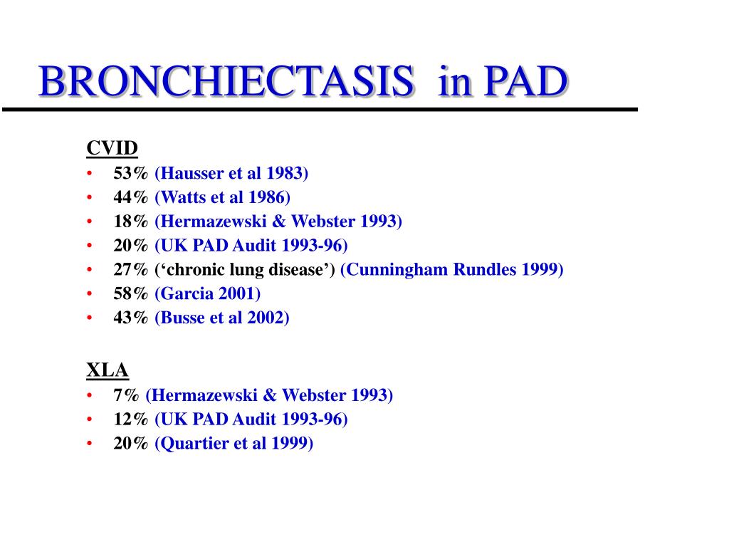 BRONCHIECTASIS in PAD CVID • 53% (Hausser et al 1983) • 44% (Watts et al 1986) • 18% (Hermazewski & Webster 1993) • 20% (UK PAD Audit 1993-96) • 27% (‘chronic lung disease’) (Cunningham Rundles 1999) • 58% (Garcia 2001) • 43% (Busse et al 2002) XLA • 7% (Hermazewski & Webster 1993) • 12% (UK PAD Audit 1993-96) • 20% (Quartier et al 1999)