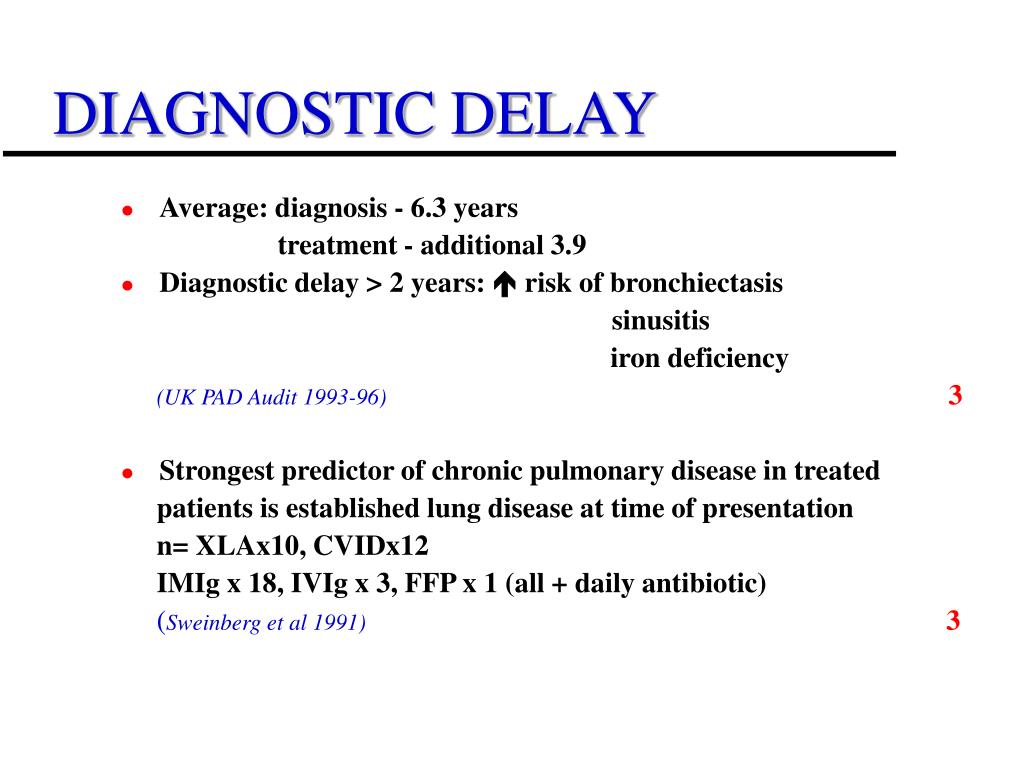DIAGNOSTIC DELAY • Average: diagnosis - 6.3 years treatment - additional 3.9 • Diagnostic delay > 2 years: risk of bronchiectasis sinusitis iron deficiency (UK PAD Audit 1993-96)3 • Strongest predictor of chronic pulmonary disease in treated patients is established lung disease at time of presentation n= XLAx10, CVIDx12 IMIg x 18, IVIg x 3, FFP x 1 (all + daily antibiotic) (Sweinberg et al 1991)3