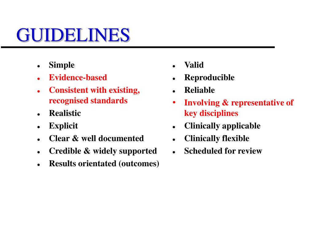 Simple Evidence-based Consistent with existing, recognised standards Realistic Explicit Clear & well documented Credible & widely supported Results orientated (outcomes) Valid Reproducible Reliable Involving & representative of key disciplines Clinically applicable Clinically flexible Scheduled for review GUIDELINES