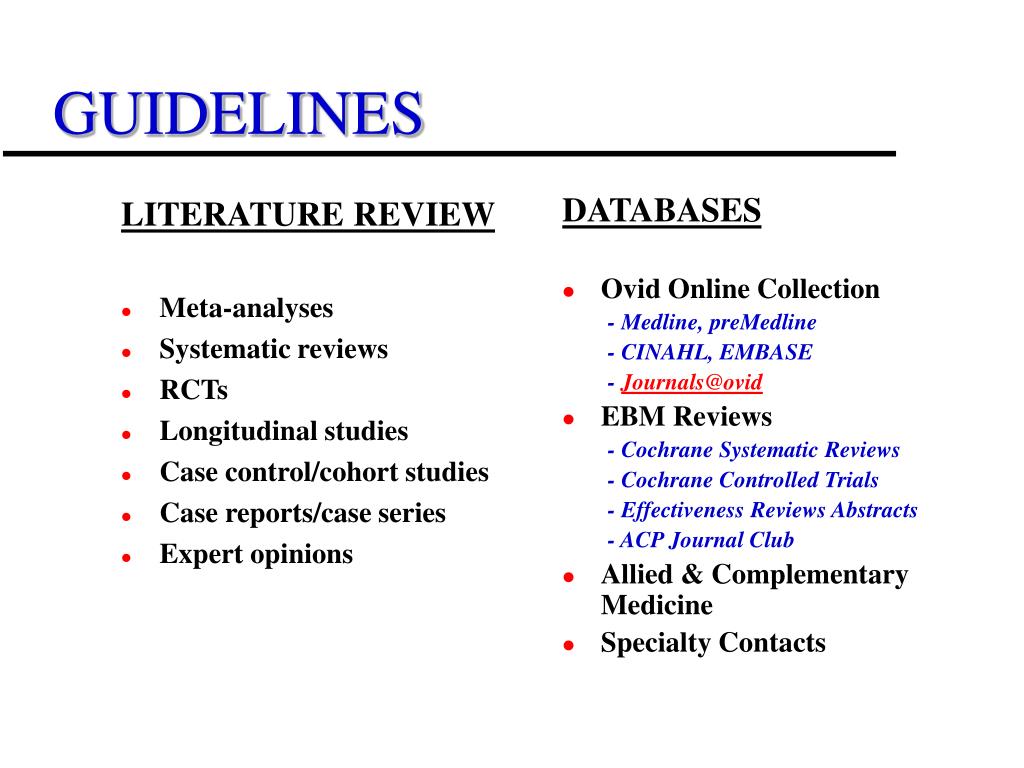 LITERATURE REVIEW Meta-analyses Systematic reviews RCTs Longitudinal studies Case control/cohort studies Case reports/case series Expert opinions DATABASES Ovid Online Collection - Medline, preMedline - CINAHL, EMBASE - Journals@ovid EBM Reviews - Cochrane Systematic Reviews - Cochrane Controlled Trials - Effectiveness Reviews Abstracts - ACP Journal Club Allied & Complementary Medicine Specialty Contacts GUIDELINES