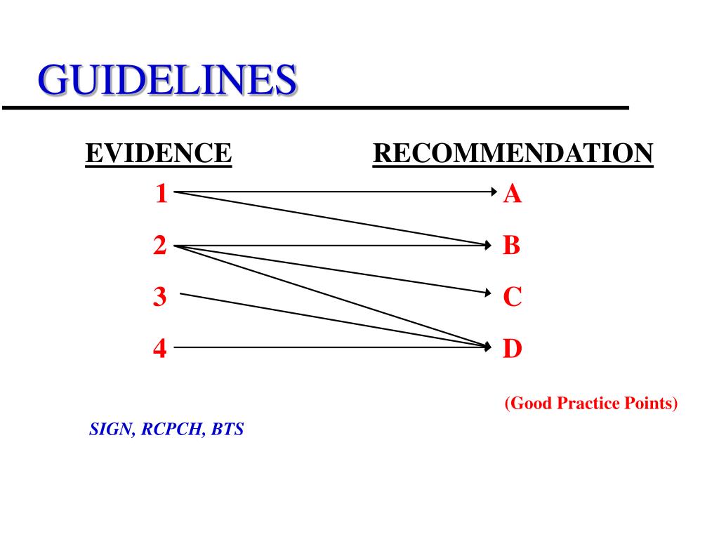 GUIDELINES EVIDENCERECOMMENDATION 1 A 2 B 3 C 4 D (Good Practice Points) SIGN, RCPCH, BTS