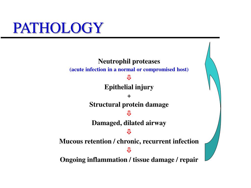 PATHOLOGY Neutrophil proteases (acute infection in a normal or compromised host) Epithelial injury + Structural protein damage Damaged, dilated airway Mucous retention / chronic, recurrent infection Ongoing inflammation / tissue damage / repair