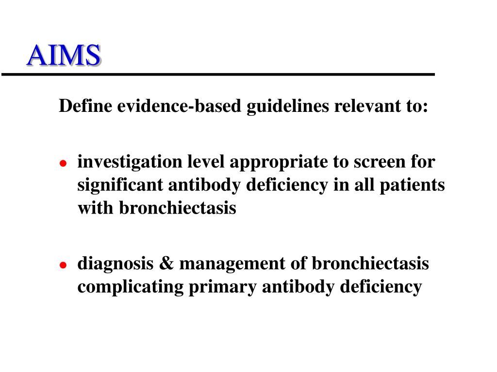 AIMS Define evidence-based guidelines relevant to: • investigation level appropriate to screen for significant antibody deficiency in all patients with bronchiectasis • diagnosis & management of bronchiectasis complicating primary antibody deficiency