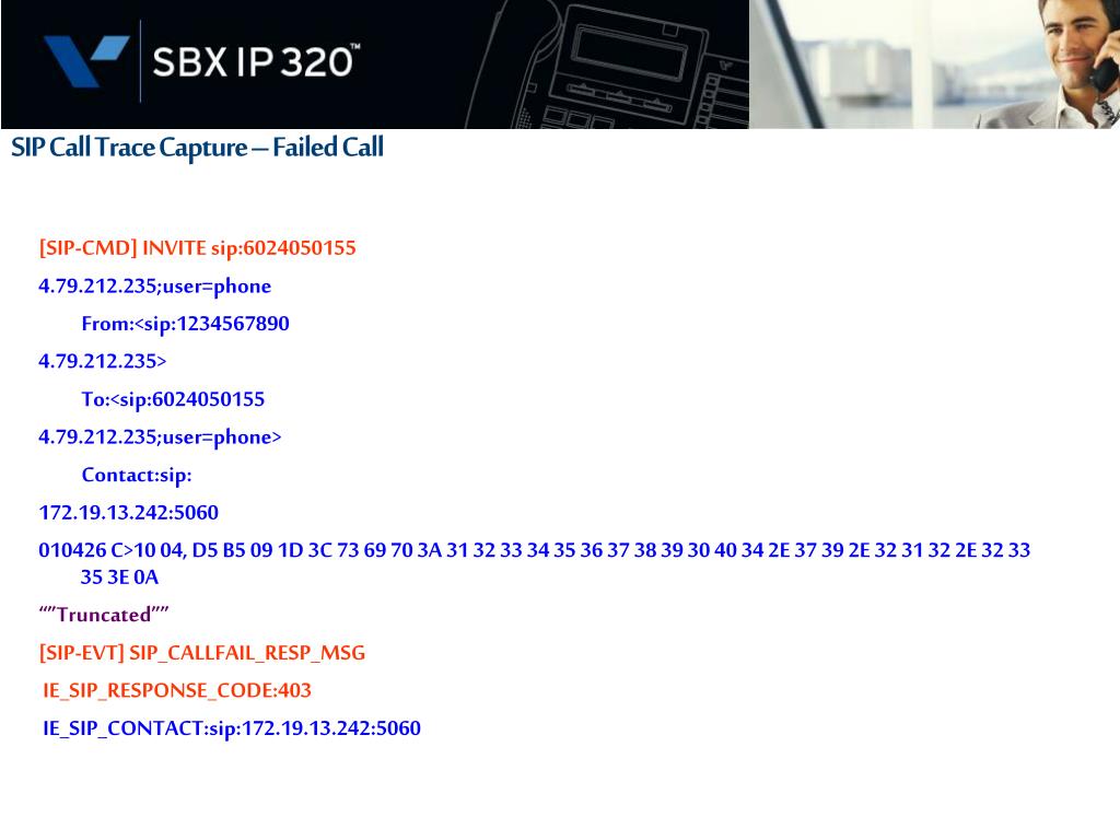 SIP Call Trace Capture – Failed Call [SIP-CMD] INVITE sip:6024050155 4.79.212.235;user=phone From:<sip:1234567890 4.79.212.235> To:<sip:6024050155 4.79.212.235;user=phone> Contact:sip: 172.19.13.242:5060 010426 C>10 04, D5 B5 09 1D 3C 73 69 70 3A 31 32 33 34 35 36 37 38 39 30 40 34 2E 37 39 2E 32 31 32 2E 32 33 35 3E 0A “”Truncated”” [SIP-EVT] SIP_CALLFAIL_RESP_MSG IE_SIP_RESPONSE_CODE:403 IE_SIP_CONTACT:sip:172.19.13.242:5060
