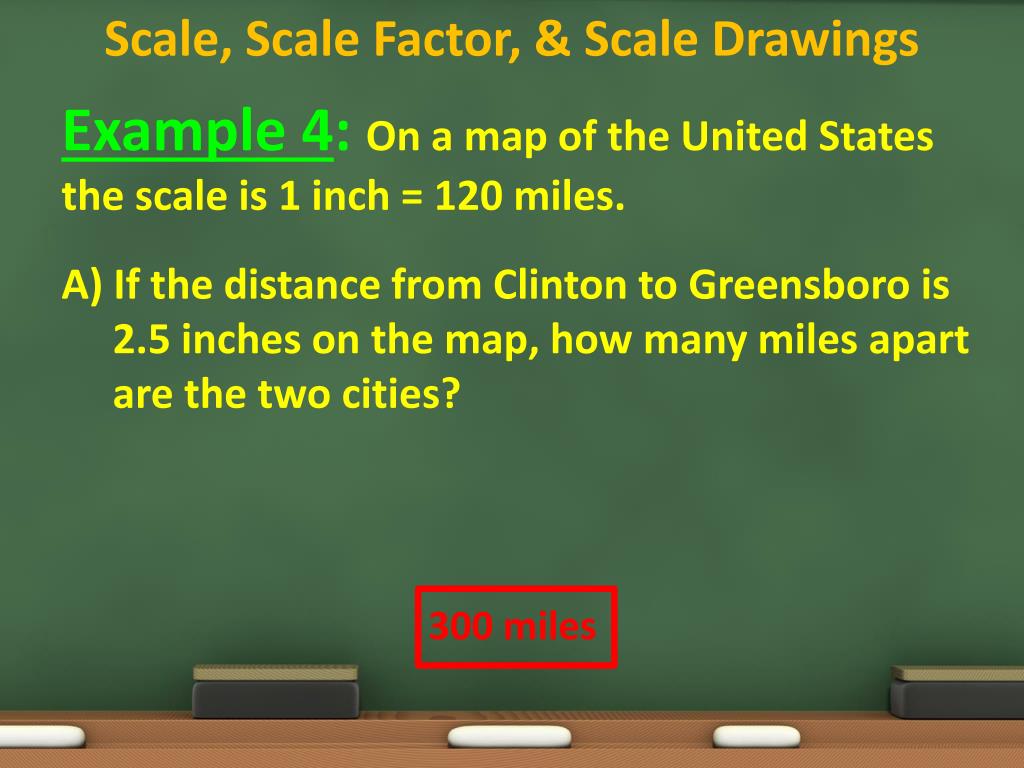Scale, Scale Factor, & Scale Drawings Example 4:On a map of the United States the scale is 1 inch = 120 miles. A) If the distance from Clinton to Greensboro is 2.5 inches on the map, how many miles apart are the two cities? 300 miles