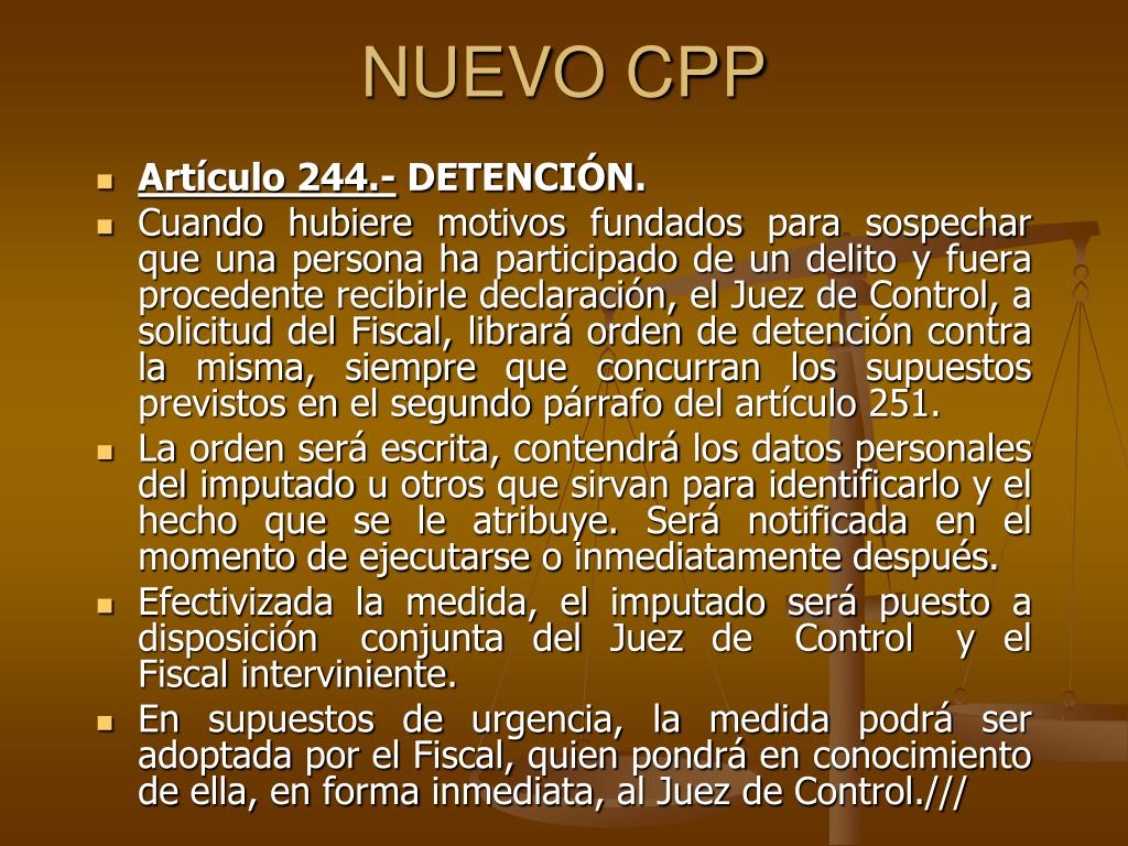 NUEVO CPP • Artículo 244.- DETENCIÓN. • Cuando hubiere motivos fundados para sospechar que una persona ha participado de un delito y fuera procedente recibirle declaración, el Juez de Control, a solicitud del Fiscal, librará orden de detención contra la misma, siempre que concurran los supuestos previstos en el segundo párrafo del artículo 251. • La orden será escrita, contendrá los datos personales del imputado u otros que sirvan para identificarlo y el hecho que se le atribuye. Será notificada en el momento de ejecutarse o inmediatamente después. • Efectivizada la medida, el imputado será puesto a disposición conjunta del Juez de Control y el Fiscal interviniente. • En supuestos de urgencia, la medida podrá ser adoptada por el Fiscal, quien pondrá en conocimiento de ella, en forma inmediata, al Juez de Control.///