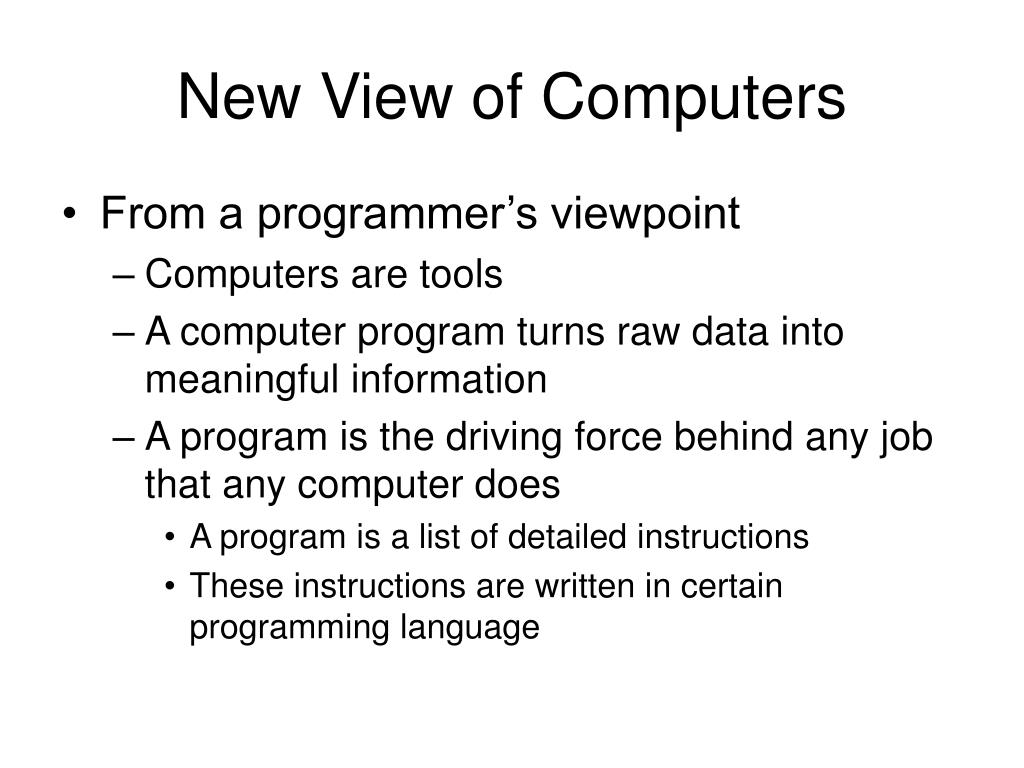 New View of Computers • From a programmer’s viewpoint • Computers are tools • A computer program turns raw data into meaningful information • A program is the driving force behind any job that any computer does • A program is a list of detailed instructions • These instructions are written in certain programming language
