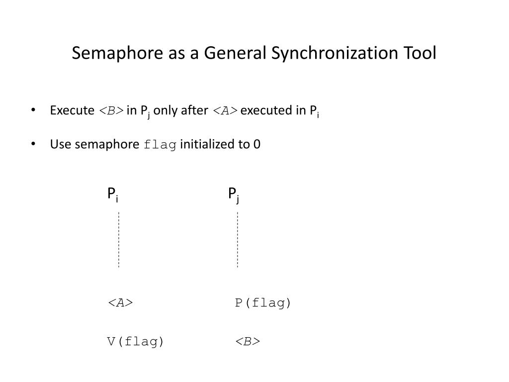 Semaphore as a General Synchronization Tool • Execute <B> in Pjonly after <A> executed in Pi • Use semaphore flaginitialized to 0 Pi Pj <A> P(flag) V(flag) <B>