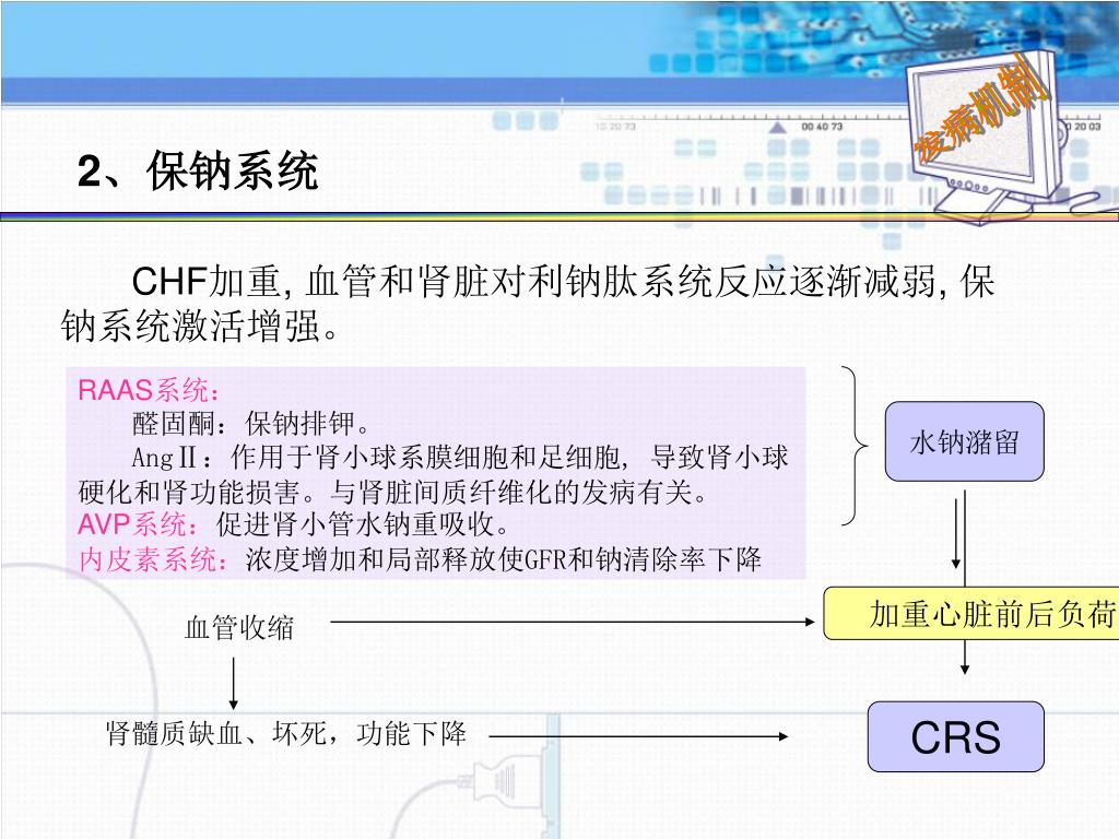 发病机制 2、保钠系统 CHF加重, 血管和肾脏对利钠肽系统反应逐渐减弱, 保钠系统激活增强。 RAAS系统: 醛固酮:保钠排钾。 AngⅡ:作用于肾小球系膜细胞和足细胞, 导致肾小球硬化和肾功能损害。与肾脏间质纤维化的发病有关。 AVP系统:促进肾小管水钠重吸收。 内皮素系统:浓度增加和局部释放使GFR和钠清除率下降 水钠潴留 加重心脏前后负荷 血管收缩 CRS 肾髓质缺血、坏死,功能下降