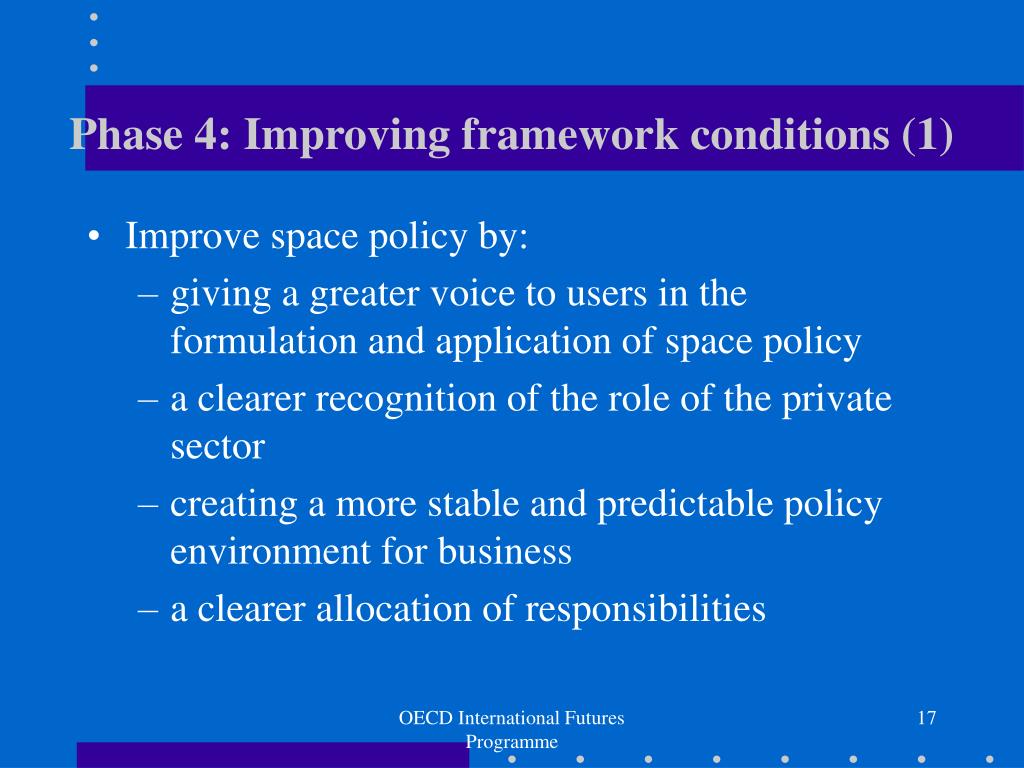 Phase 4: Improving framework conditions (1) • Improve space policy by: • giving a greater voice to users in the formulation and application of space policy • a clearer recognition of the role of the private sector • creating a more stable and predictable policy environment for business • a clearer allocation of responsibilities OECD International Futures Programme