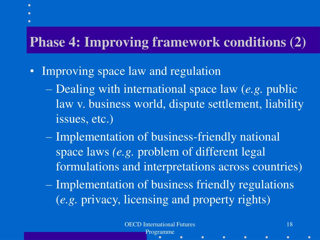 Phase 4: Improving framework conditions (2) • Improving space law and regulation • Dealing with international space law (e.g. public law v. business world, dispute settlement, liability issues, etc.) • Implementation of business-friendly national space laws (e.g. problem of different legal formulations and interpretations across countries) • Implementation of business friendly regulations (e.g. privacy, licensing and property rights) OECD International Futures Programme