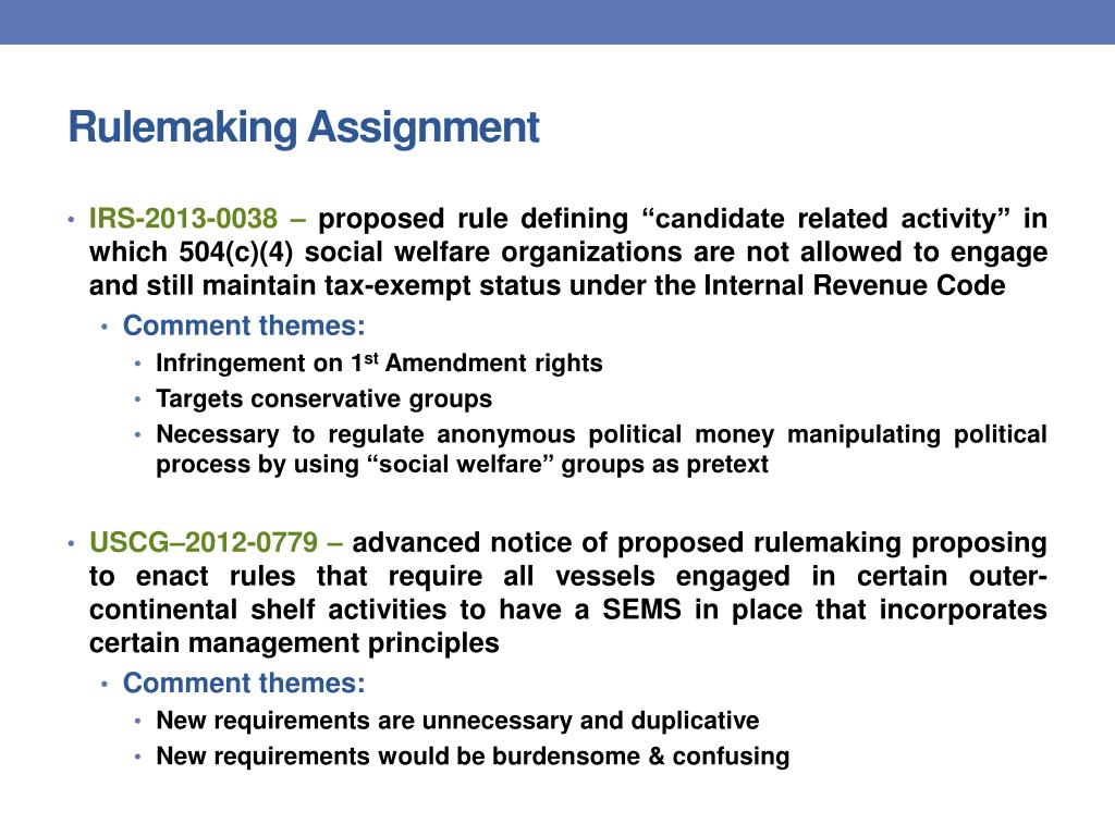 Rulemaking Assignment • IRS-2013-0038 – proposed rule defining “candidate related activity” in which 504(c)(4) social welfare organizations are not allowed to engage and still maintain tax-exempt status under the Internal Revenue Code • Comment themes: • Infringement on 1st Amendment rights • Targets conservative groups • Necessary to regulate anonymous political money manipulating political process by using “social welfare” groups as pretext • USCG–2012-0779 – advanced notice of proposed rulemaking proposing to enact rules that require all vessels engaged in certain outer-continental shelf activities to have a SEMS in place that incorporates certain management principles • Comment themes: • New requirements are unnecessary and duplicative • New requirements would be burdensome & confusing