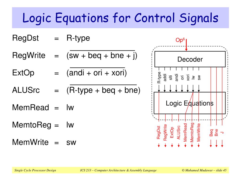 slti R-type addi andi ori xori lw sw Logic Equations for Control Signals RegDst = R-type RegWrite = (sw + beq + bne + j) ExtOp = (andi + ori + xori) ALUSrc = (R-type + beq + bne) MemRead = lw MemtoReg = lw MemWrite = sw Op6 Decoder Logic Equations RegDst RegWrite ExtOp ALUSrc MemRead MemtoReg MemWrite Bne J Beq